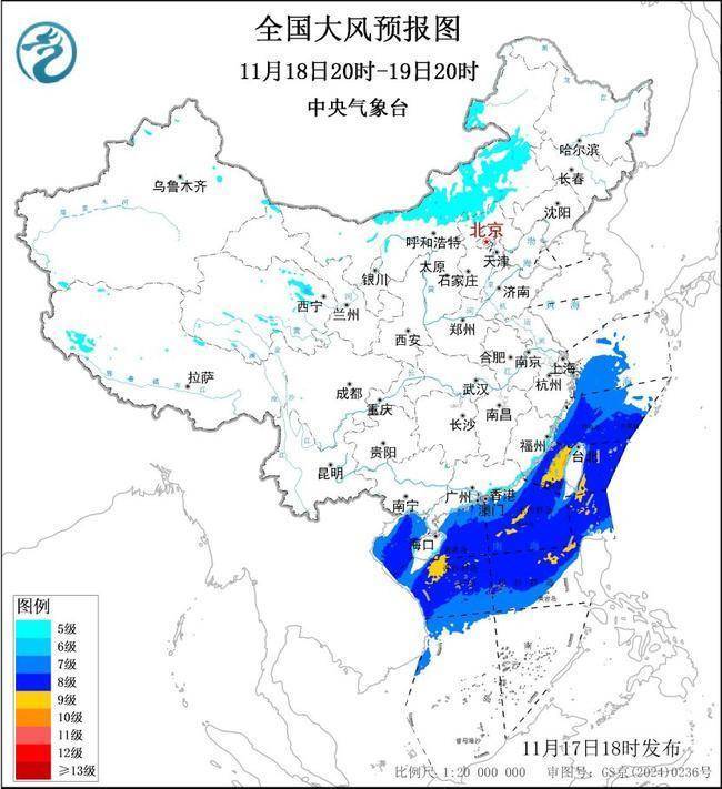 11月18日20时至19日20时,青海东部和南部、西藏南部、内蒙古中东部、华北北部、浙闽东部沿海有5~6级、阵风7~8级的大风;东海大部海域、台湾海峡、台湾以东洋面、巴士海峡、南海北部和中部海域、北部湾将有7~8级、阵风9~10级的大风,其中台湾海峡、台湾以东洋面、巴士海峡、南海东北部和中西部的部分海域风力可达9级、阵风10~11级。